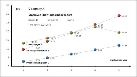 Figure 1: Employee Knowledge Index report – time series – sample for three employees over a 5 year period.